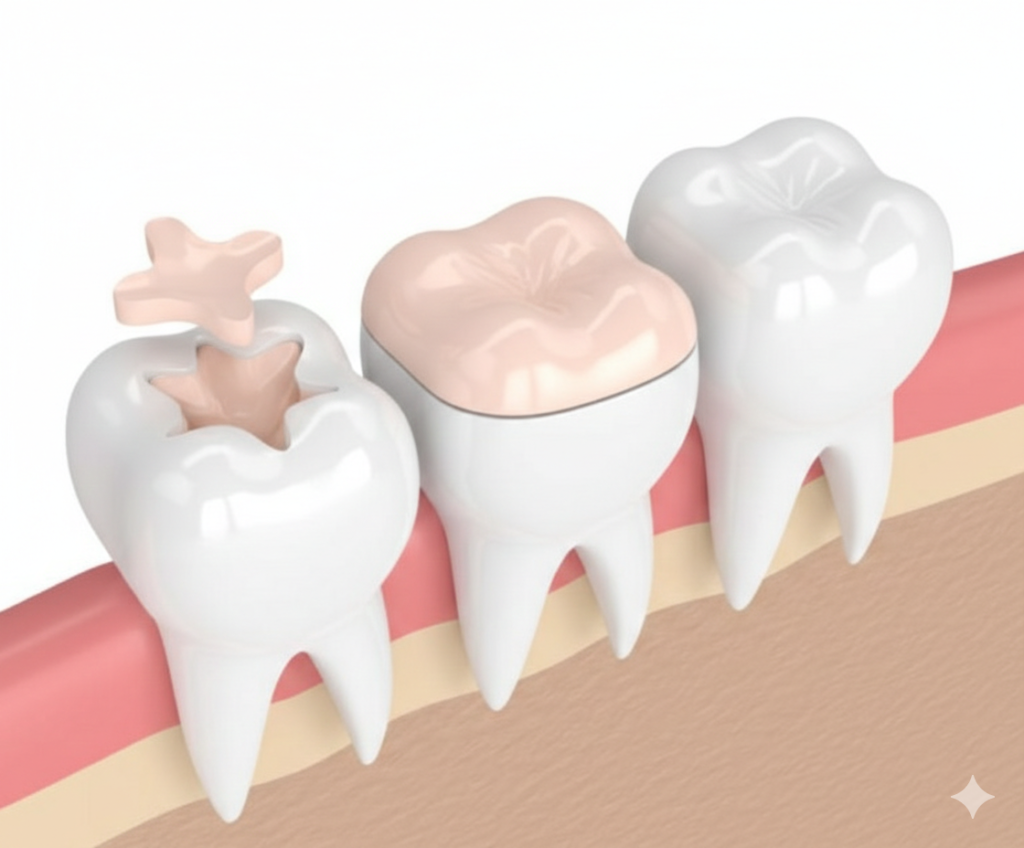 Für größere Rekonstruktionen bieten passgenaue Inlays eine besonders langlebige und stabile Lösung aus Keramik oder Gold.