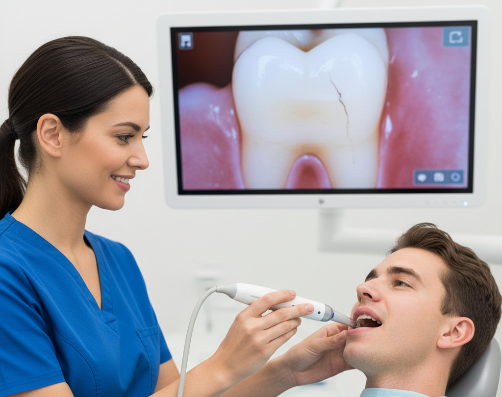 Mithilfe der intraoralen Kamera machen wir kleinste Details Ihrer Zahnoberflächen sichtbar, sodass Sie den Zustand Ihrer Zähne gemeinsam mit uns direkt am Monitor verfolgen können.